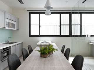 |玻光線條中的輕暖節奏。空間以光為筆,勾勒理性又充滿呼吸感的生活場域。大片玻璃拉門模糊公私界線,創造無壓又延伸的日常感;黑框、幾何圖騰與冷色調地毯點出現代節奏,讓整體在理性中保有趣味。是藝術,也是日常。