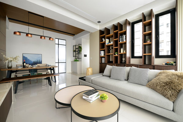 空間以深木紋理延展視覺厚度,搭配線性分割與格櫃展示,形塑出理性又溫潤的居家輪廓。