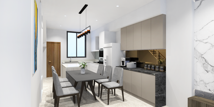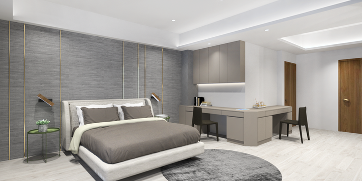 空間圍繞著一面深木展示書牆展開,搭配石白櫃體與金屬吊燈,在簡約中注入恰如其分的光感與節奏。生活不需喧鬧,只要恰好有光、有書、有琴聲。