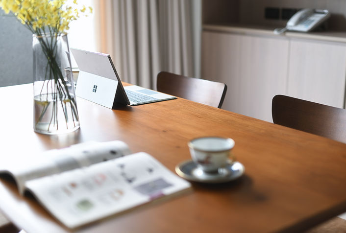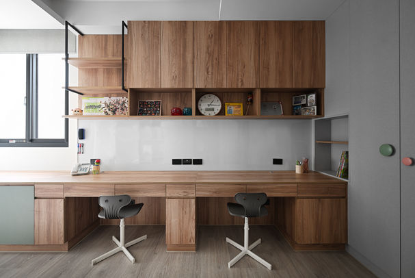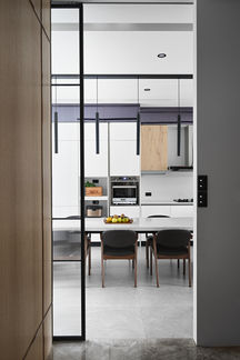 金屬、玻璃與淺木皮在不同區塊中錯位交疊,構築出開放但不凌亂的日常場景。